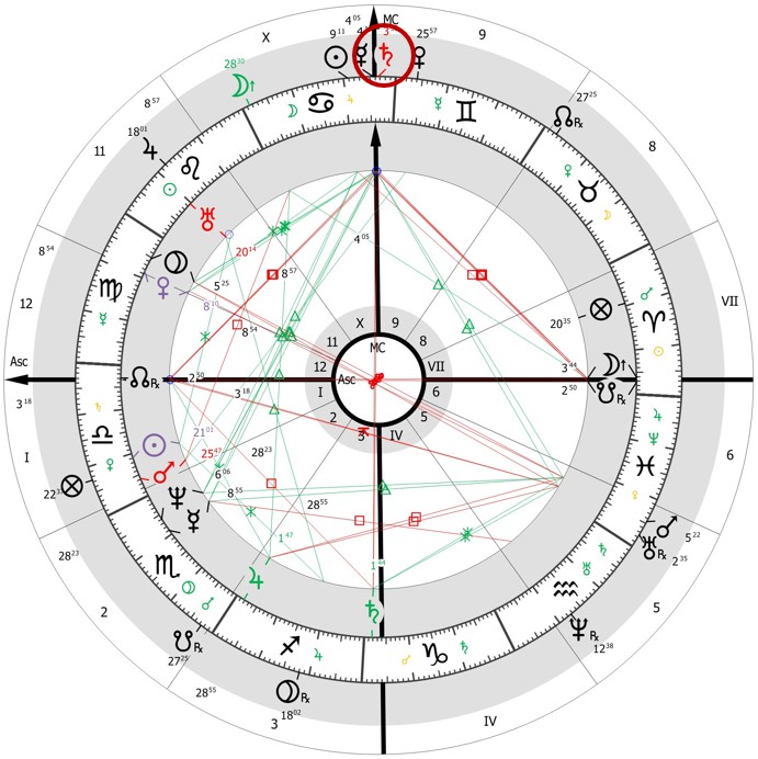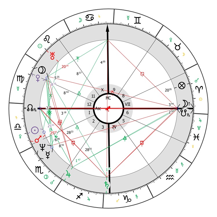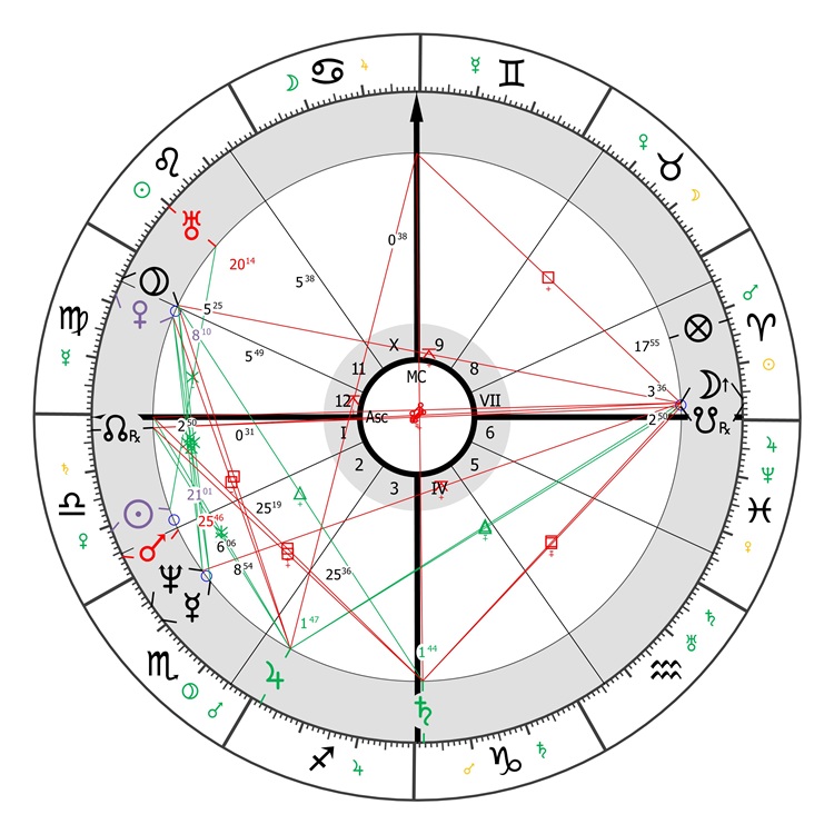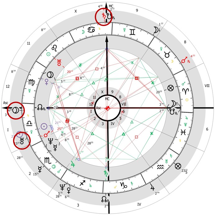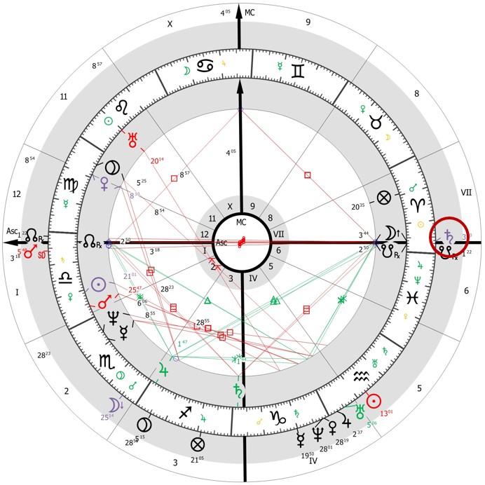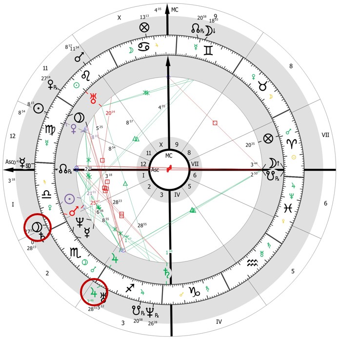 Első lépésben rajzoljuk fel a születési képletet úgy, hogy az Aszcendens a Mérleg első fokán álljon! Az így kapott ábra (1. ábra) igen kedvező ígéreteket hordoz. A születési uralkodó planéta a Vénusz, a 12. házcsúcs közelében áll: ez az elvonulásokhoz és az egyedülléthez való viszonyát jeleníti meg. A Vénusz együtt áll a Plútóval: hatalomhoz fűződő kapcsolatot és a hatalommal való rendelkezést mutatja mások felett. A Hold, amely a X. ház jegyura (hivatás témaköre), a VII. ház (külvilág témaköre) csúcsánál áll, amely utalhat egy olyan személyre, aki ismert, népszerű, és akinek a közönség előtti szereplés a hivatása. A Szaturnusz a IV. ház (otthon, család, származás) jegyuraként éppen ezen a házcsúcson áll, ami hűen tükrözi a gyermekkor nehéz körülményeit.
