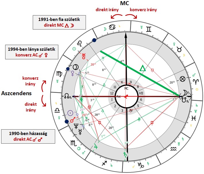 - 1994-ben, a leány születésének évében, a konverz irányban eldirigált Aszcendens együttállásba kerül a radix Vénusszal (Szűz 8°10′). A Vénusz a káldeusi sorrend szerint 5. házas planéta, így szintén kapcsolatba hozható a gyermekszületéssel.