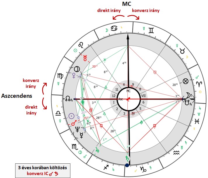 - Ugyanezen időszakban a konverz irányban eldirigált Aszcendens trigon aspektusba kerül a radix Szaturnusszal (Bak 1°47′). Ebben az időszakban nem érezte jól magát, nem mert erős döntéseket hozni, és kritikákat kapott a felelősségvállalás terén. Ezek a nehézségek és a felelősséghez kapcsolódó helyzetek egyértelműen a Szaturnuszhoz társíthatók.