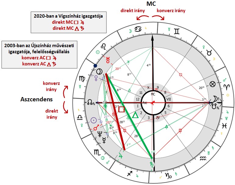 - 2020-ban, amikor a Vígszínház igazgatója lett, a direkt irányban eldirigált MC kvadrát aspektusban áll a radix Jupiterrel (Nyilas 1°47′). Ez ugyanahhoz a jelölőhöz kapcsolódik, mint 2003-ban, csak egy másik főtengely által. A Jupiter a X. ház egzaltációs uraként ekkor is kiemelkedő karrierlehetőséget jelzett számára.
