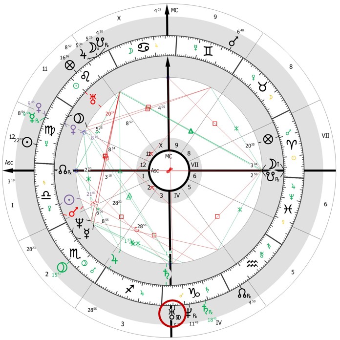 - Hároméves korban a konverz irányban eldirigált IC együttállásba kerül a radix Szaturnusszal (Bak 1°44′), emellett ugyanebben az időszakban a konverz irányban eldirigált Aszcendens kvadrát aspektusba kerül a radix Szaturnusszal. A Szaturnusz a IV. ház jegyura, így jelölője a családdal, otthonnal, lakóhellyel kapcsolatos eseményeknek.