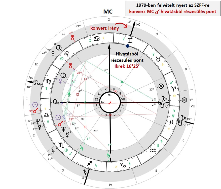 - 1979-ben, a főiskolai felvétel évében a konverz irányban eldirigált MC együttállásba kerül a hivatásból részesülés ponttal (az esemény dátumát 1979. szeptember 1-jére vettem fel). Ez egyértelmű primer direkciós jelzésként értelmezhető.